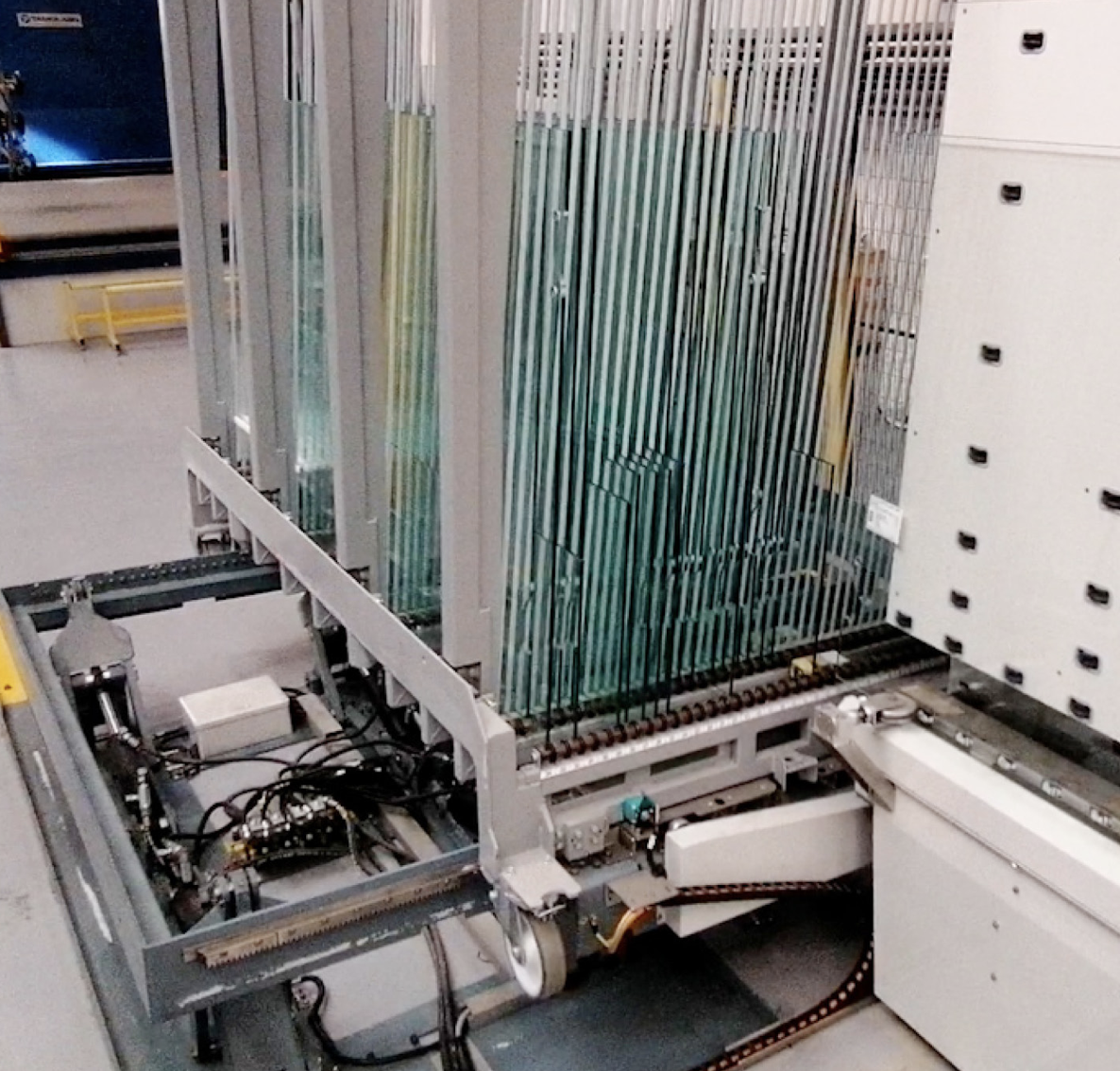 De Systron SHUTTLE is een automatische verticale glastransportrobot die glasplaten tussen bewerkingsstations transporteert. Het railsysteem is ontworpen voor zeer hoge snelheden en acceleraties.